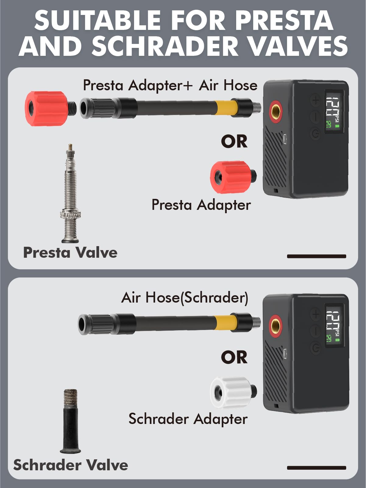 - Schrader and Presta Valves Compatibility: Our protable bicycle tire pump comes with two different valve adapters, making it simple to switch between Schrader and Presta valves. The adapters can be directly inserted into the respective valve types for inflation, and the included air hose offers flexibility in choosing the most convenient inflation method. Suitable for most city bikes, mtb, fat tire bikes, road bikes, gravel bikes, folding bikes, ebikes, etc.